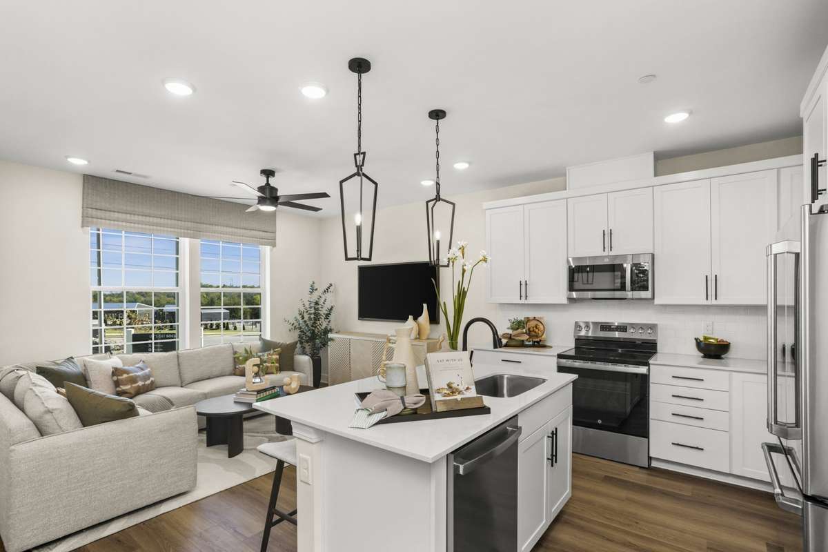 This 3 Bed / 2. 5 Bath “Kipling” townhome offers 9’ ceilings, an open- concept layout, and a stylish kitchen with white cabinetry, quartz countertops, stainless steel appliances, and a large island perfect for entertaining. All bedrooms are upstairs with walk- in closets. The primary suite features double sinks and a tile shower.